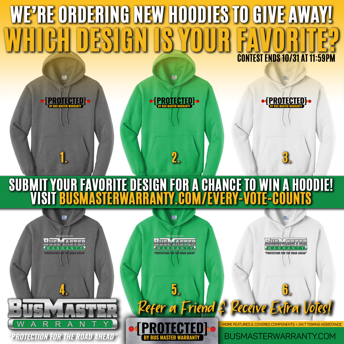 Please take a moment to let us know which design you like best for our upcoming Free Hoodie Friday Promotion and be entered to win! If you have a bus related contact feel free to share this contest with them! Simply have then enter your name as a referral and your vote counts twice!